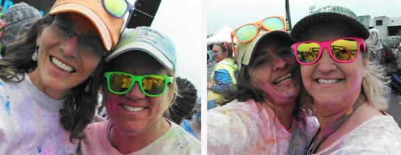 The emcee was a hilarious dreadlock man in pink leopard tights — he set the tone for fun. We saw runners and walkers of all ages, from little ones in strollers to grandmothers. We saw lots of women in colorful tutus, even some men in tutus. We saw bunny ears, wigs, assorted costumes and an entire bridal party in white with the bride in her full length gown. By the end of the event, all were completely covered in color! We power walked our way thru the course in less than an hour and had a blast – we are already looking forward to next year’s festivities! Just another way to live a colorful life. (thanks girls for sharing your photos)