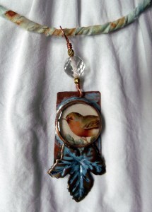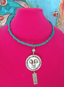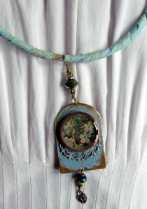 Just a little peek at what I’ve been working on – mixed media necklaces on hand dyed silk, cotton and linen wrapped wire– super comfy and unique. Featuring resin, copper, brass, beads, shells and charms. Available at Shooting Star Gallery very soon.