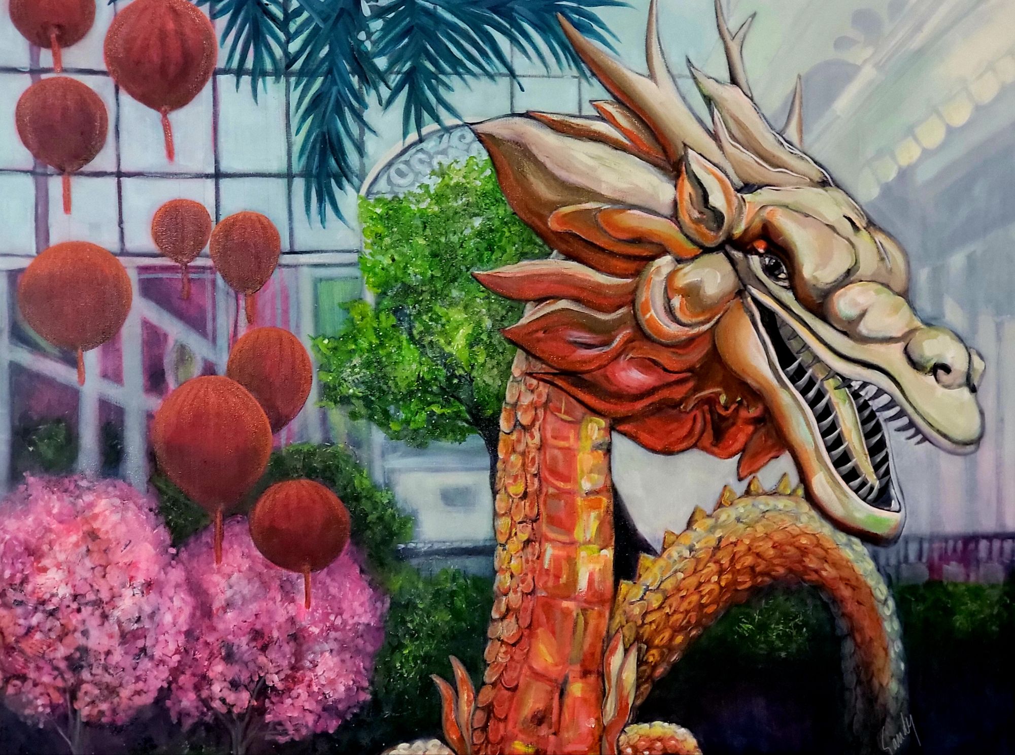 “Year of the Dragon” mixed media/oil on gallery wrapped canvas. 48″x36″.