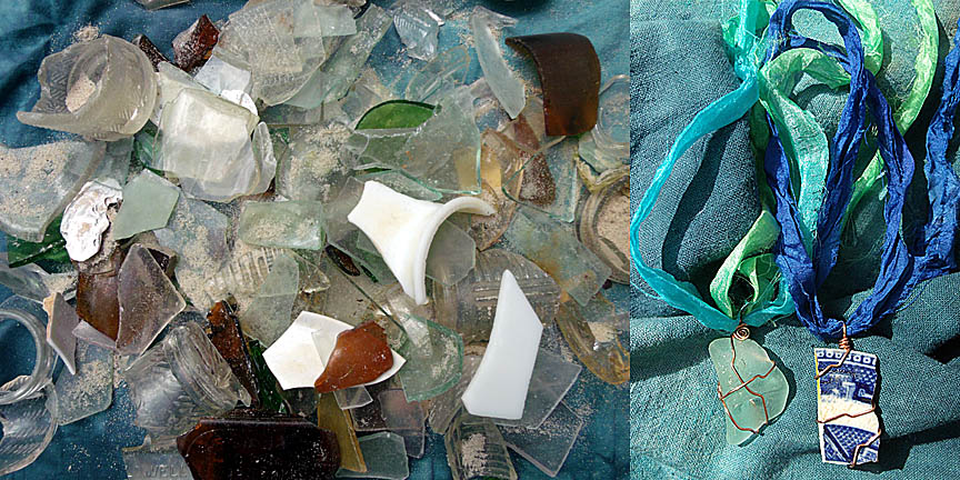 Some call beach glass “trash”… others call it “treasure”. I guess it just depends on your perspective. For years, I’ve been searching for tiny bits of sunshiny color on the beach. Finding the perfect shell is always a thrill, but finding a bright green or blue blob of beach glass, just the right size for a wire-wrapped necklace, is like finding buried treasure! It has to be ripe too — worn down by the waves and sandy bottom until sugar coated and smooth.