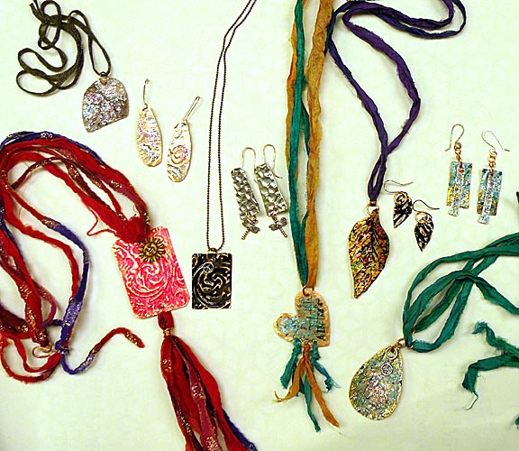 We started with wire jump rings, clasps and ear wires, then moved on to the sheet metal: cutting, filing, sanding, shaping, then adding texture and color. A new addition to the class this time was the texture plate machine – usually used for scrapbooking and paper crafts – it adds amazing textures to sheet metal 26 gauge and thinner.